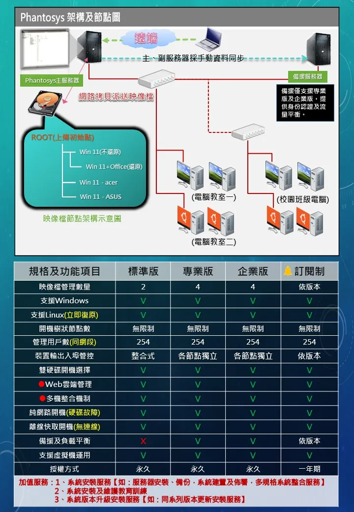 2 系統內部提供DHCP服務(無需另外安裝程式)、AD網域支援、遠端控制(喚醒及關機)、流量限制管理及IP設定(固定或虛擬)之網管功能。